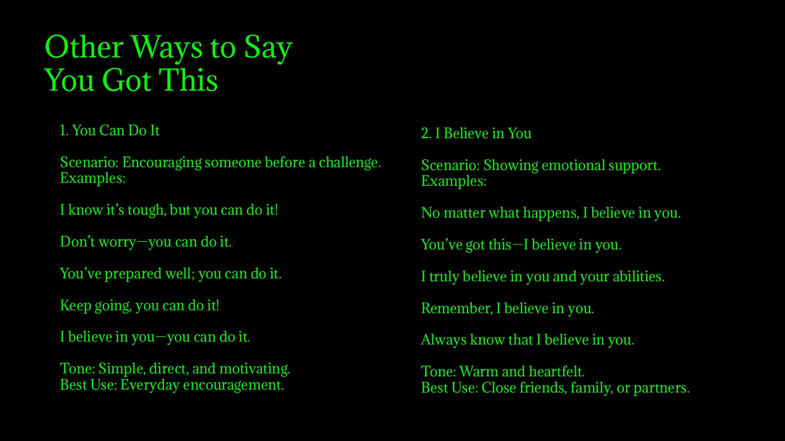 Saying “You got this” is a simple yet effective way to encourage someone. Using a variety of expressions allows you to tailor your support to the situation, person, and tone, making your encouragement more heartfelt, motivational, and impactful. From casual friends’ chats to professional or high-pressure moments, these 37 alternatives give you a toolkit to inspire confidence, positivity, and resilience every time.